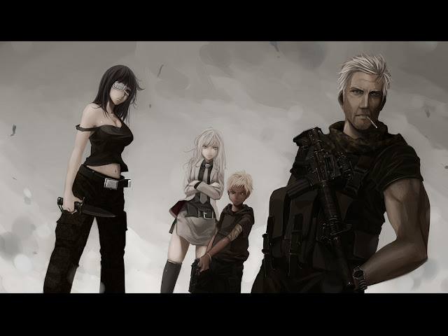 The Arms Dealer in this picture is located all the Way in the Back. The Albino looking chick in the back right beside the child soldier. This anime Revolves around the Arms Dealer named Koko Hekmatyr, no she is not a dog, She is crazy like a wolf, but not a dog. the Art is not great, everything is well drawn and nothing is wrong with the landscapes, Cities, etc. However the characters are drawn weird and the definition of cute is close to the 7 dwarves which is not bad. The story/plot however is the what makes this anime F****** Awesome and will keep your eyes peeled until the last episode of the Season. Since the season for this anime is done doesn't mean that it is finish. Most anime stop in a certain point and an anime doesn't stop until the end of one of the four seasons.